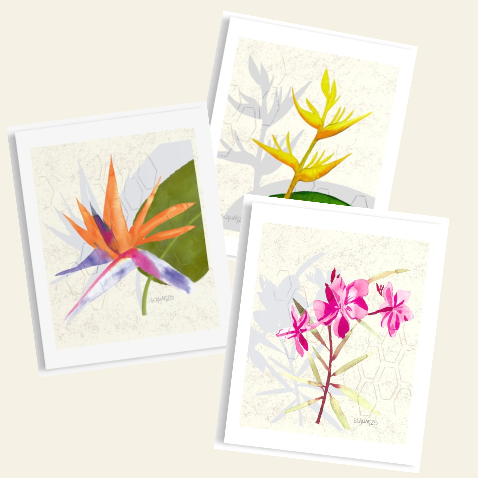 In My Mother's Garden, is a departure — quieter and more tender than my usual work. Twelve botanical watercolors inspired by photographs my mother sent me from her garden in Haiti. Available as a wall calendar, art prints, and greeting cards.